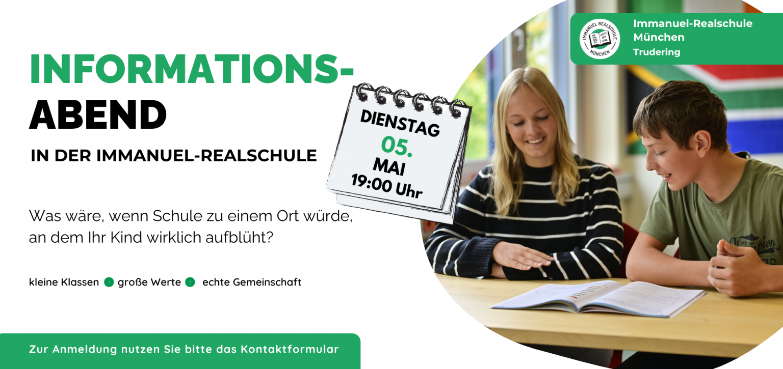 Die Immanuel Realschule München besteht seit dem Schuljahr 2023/24. Sie war entstanden, weil die Eltern/Erziehungsberechtigten, deren Kinder bereits die Immanuel Schule (Grundschule) in München-Sendling besuchten, eine weiterführende Schule im selben Geist und Sinne suchten. Das vierstöckige Bürogebäude Am Moosfeld 3 in München-Trudering/Riem bietet nun alles, was dem Schulträger wichtig ist: Eine ruhige und dennoch zentrale, sonnige Lage, großzügige Räume in der ersten Etage mit ansprechender Innenausstattung. Die Schule ist gut mit den öffentlichen Verkehrsmitteln (Buslinien 194 und 185, U2, S4 und S6) erreichbar.